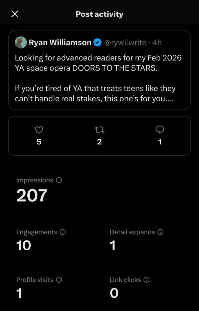 Because all that other stuff is cool and all, but it converts less than one person out of over two hundred into someone interested in my writing. And sure, maybe roughly 0.5% conversion isn’t terrible by social media standards—but that’s supposed to be offset by organic amplification through shares and retweets. Without that, I’m just treading water, spending years building an audience that will never organically grow my readership. For whatever reason no one shares my writing-related content.